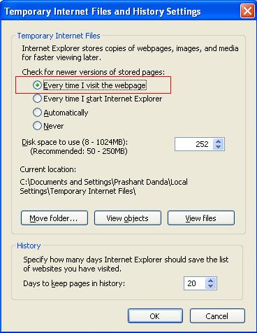 • Click on "(*) Every time I visit the webpage" radio button in the "Temporary Internet Files and History Settings" window as shown in the image below